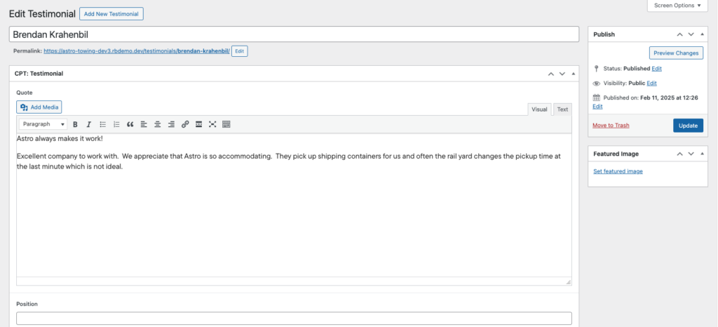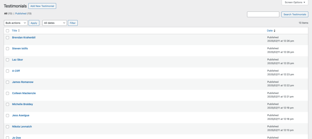 To create a new post, select Add New Testimonial.